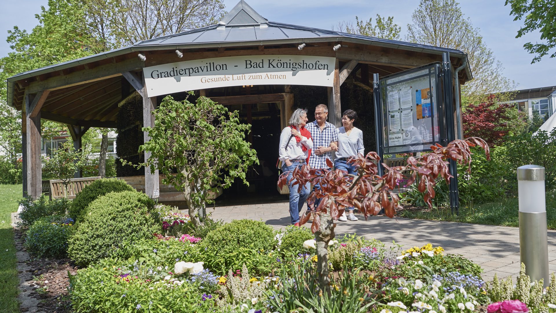 In Bad Königshofen sei die Besonderheit, dass man nicht nur Außen, sondern auch Innen im Pavillon gehen und sitzen kann. Dadurch werde das salzhaltige Gemisch noch intensiver eingeatmet und wirke besser. Gespeist wird er von der Urbaniquelle, die gegenüber an der ehem. Trink- und Wandelhalle entspringt. Die Holzbauweise aus Fichtenholz, die mit Schwarzdorn ausgefüllt ist, ermöglicht einen optimalen Wasser-Verdunstungsprozess. An ihren Flächen wurde die Sole so lange abgetröpfelt, bis der Salzgehalt auf rund 25 Prozent angestiegen ist. Daher auch der Name Gradierwerk. Durch das Einatmen salzhaltiger Luft werden die Atemwege befeuchtet und die Wandungen der Atemorgane positiv beeinflusst. Darüber hinaus besitzen die feinen Salzkristalle eine sekretlösende Wirkung, die die Atemwege intensiv von Bakterien reinigen und die Schleimhäute abschwellen lassen.