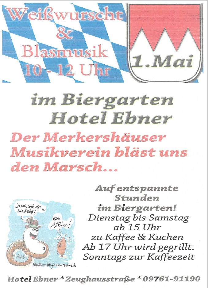 Pünktlich zum 1. Mai lädt das Hotel Ebner in seinem Biergarten zum Weißwurschtessen & Blasmusik ein. Ab 10 – 12 Uhr bläst Ihnen der Musikverien Merkerhausen den Marsch. Freuen Sie sich auf entspannte Stunden im Biergarten.