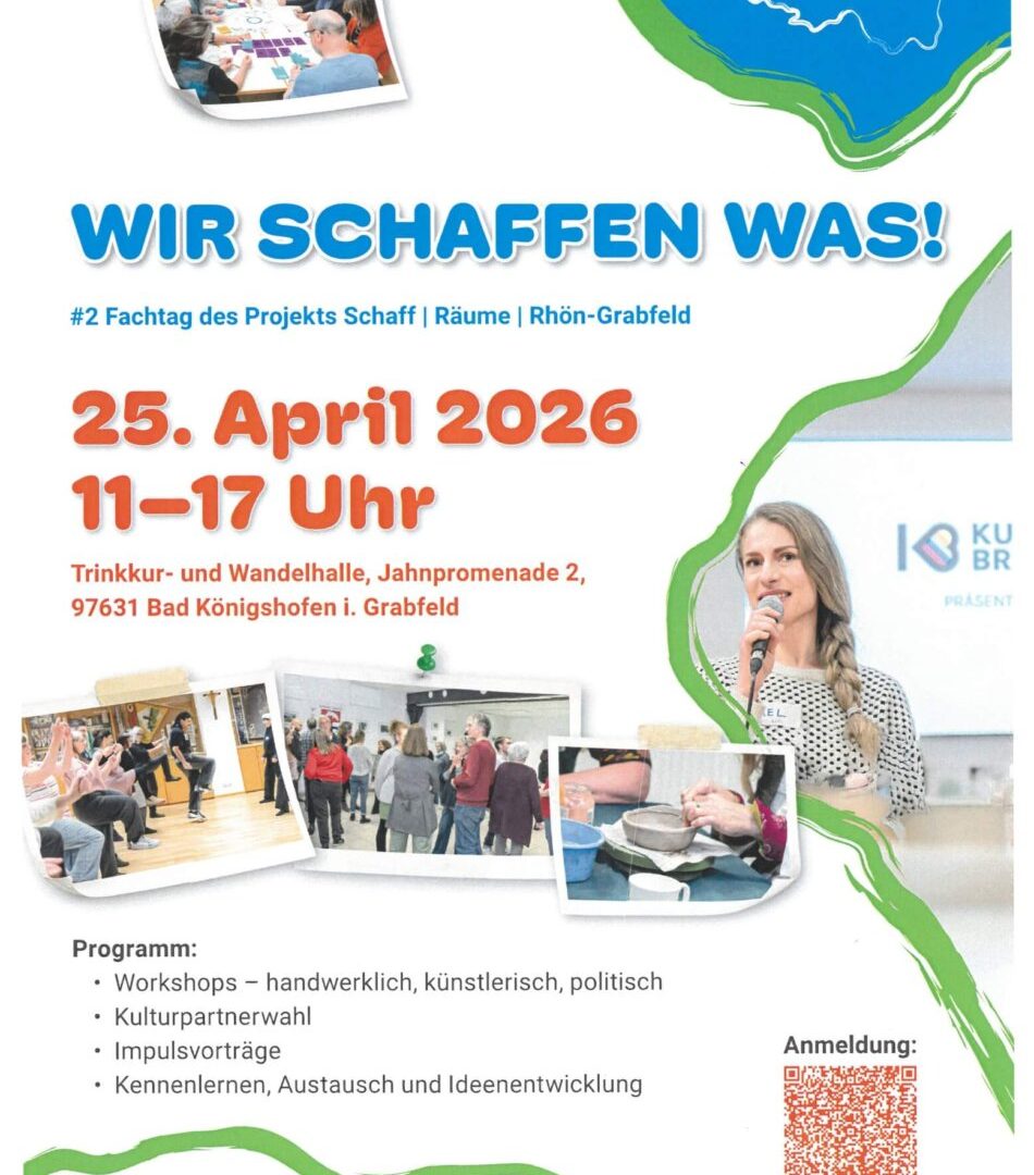 Das Motto des 2. Fachtages des Projekts Schaff / Räume / Rhön-Grabfeld heißt „Wir schaffen was“ und findet am 25. April 2026 von 11 – 17 Uhr in der Trinkkur- und Wandelhalle in Bad Königshofen statt.