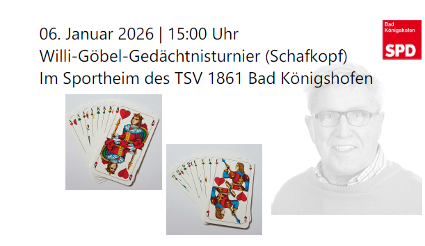 Am Dienstag, den 06.01.2026 findet ab 15.00 Uhr im Sportheim des TSV Bad Königshofen das Wili-Göbel-Gedächtnisturnier (offenes Schafkopf-Turnier) statt. Veranstalter ist der SPD Ortsverein Bad Königshofen. Startgebühr: 5,00€ pro Teilnehmer.